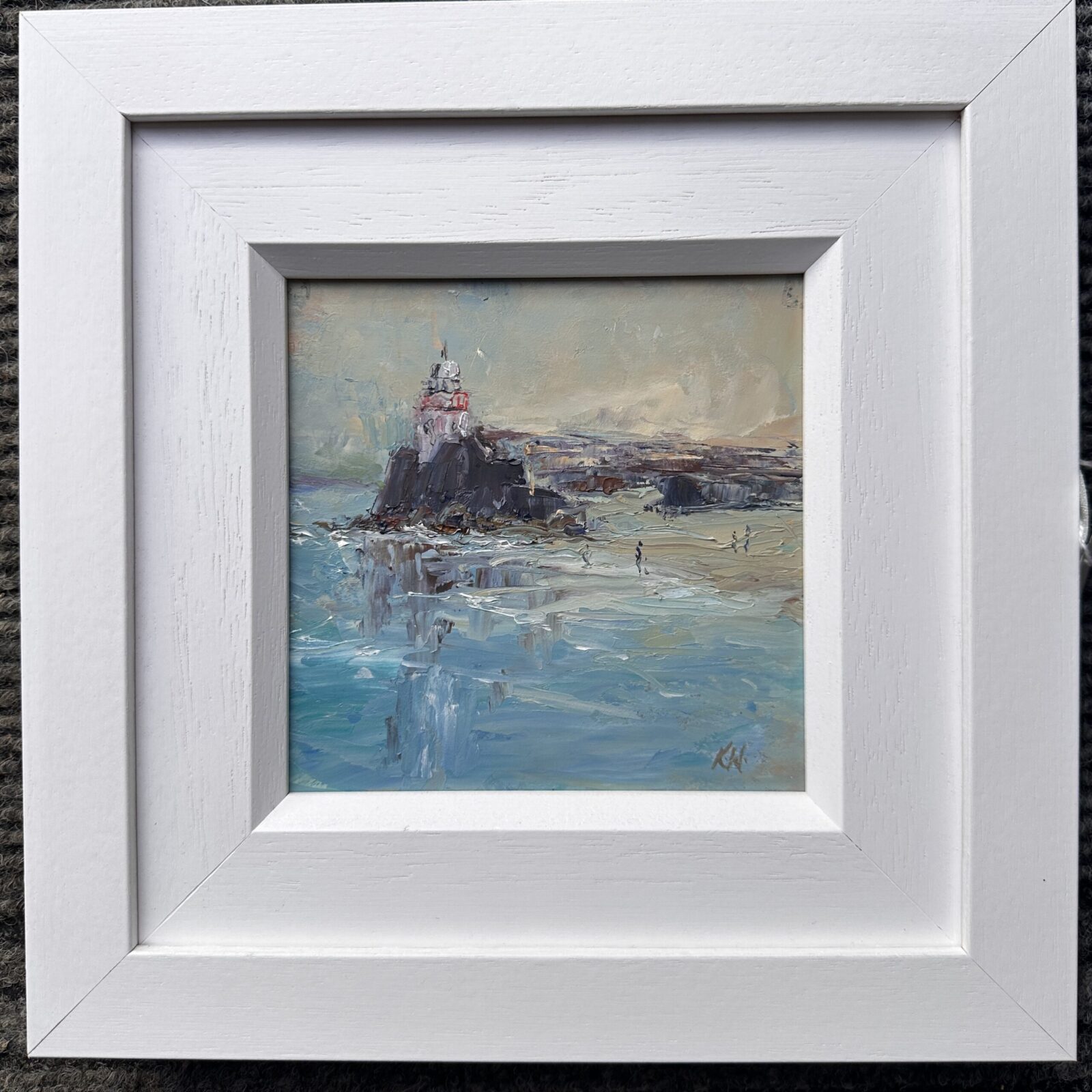 Miniature oil painting 6″ x 6″ of Balbriggan Lighthouse.