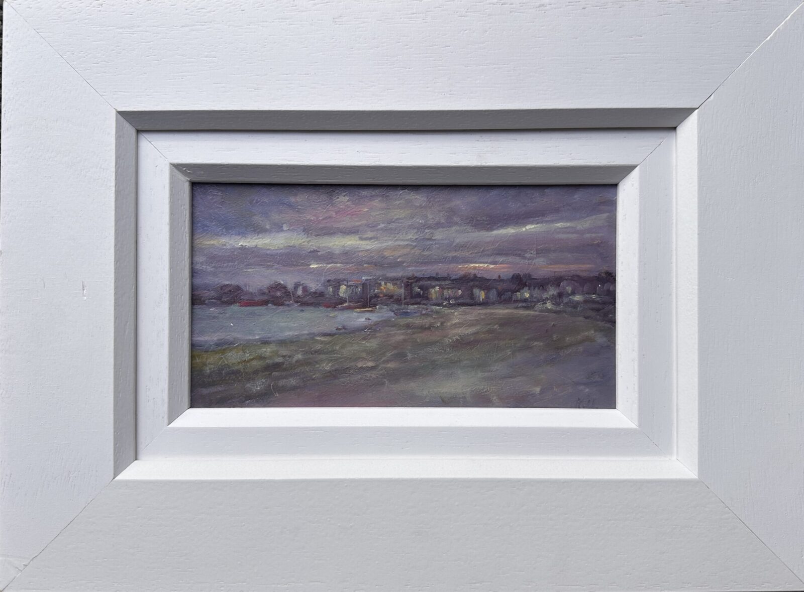 Miniature oil painting 6″ x 9″ of Skerries Harbour at twilight.